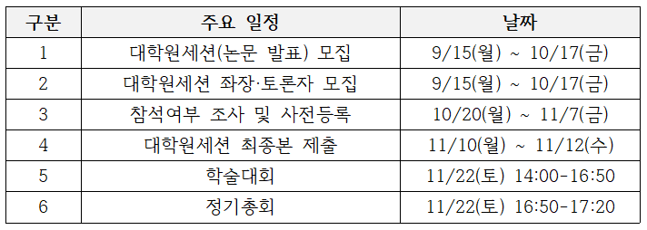 1) 대학원세션 신청(초록 제출) : 9/15(월) ~ 10/17(금)