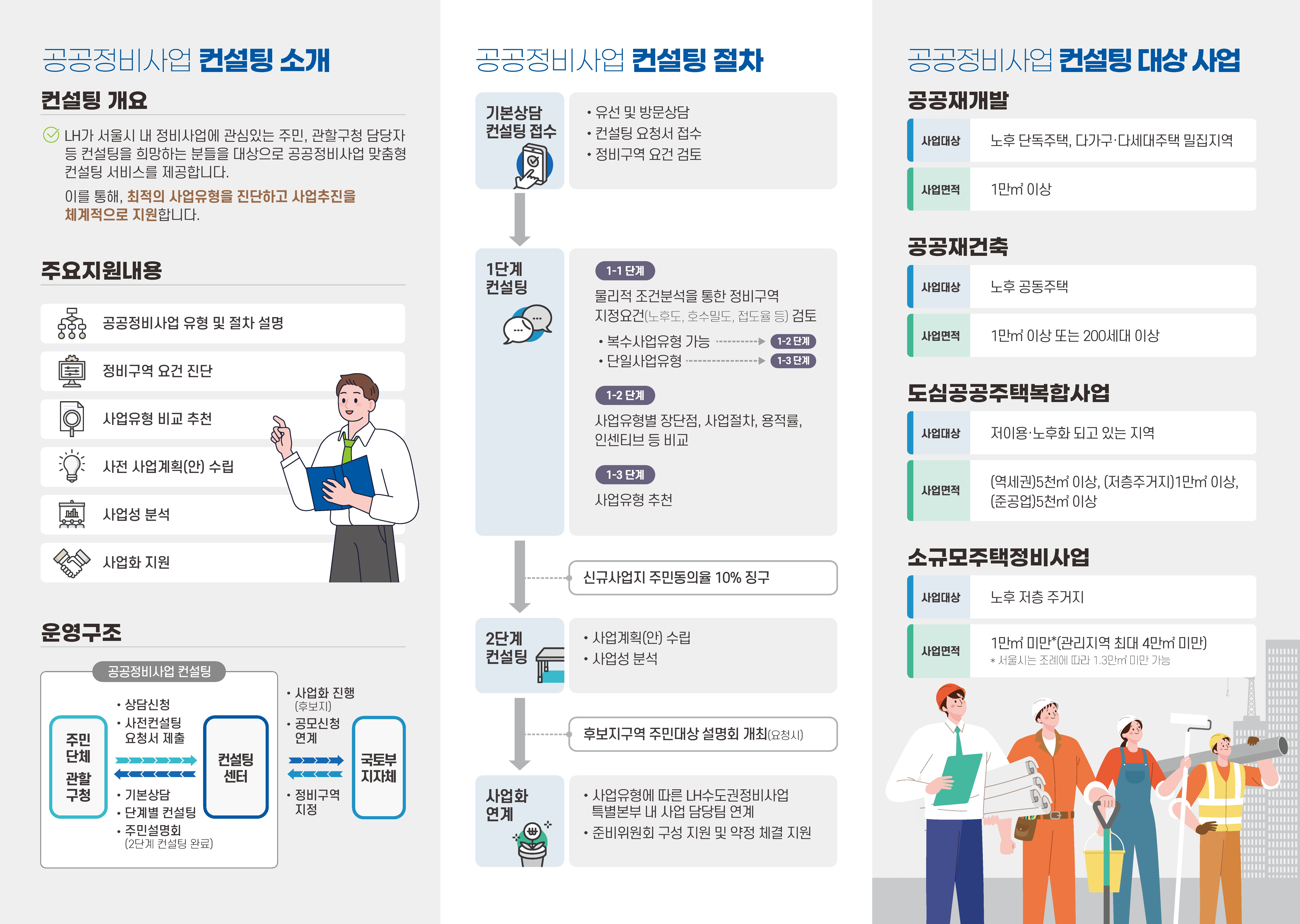 * 주요 지원 내용 : 공공정비사업 유형 및 절차 설명, 정비구역 요건 진단, 사업유형 비교 추천, 사업계획(안) 수립, 사업성 분석, 사업화 지원