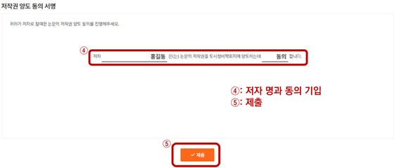 4단계: 논문투고 ‘Step 1. 학술지 정책 및 저자 동의’에서 ‘저자 동의 사항’을 잘 확인하신 후 체크해 주시길 바랍니다.